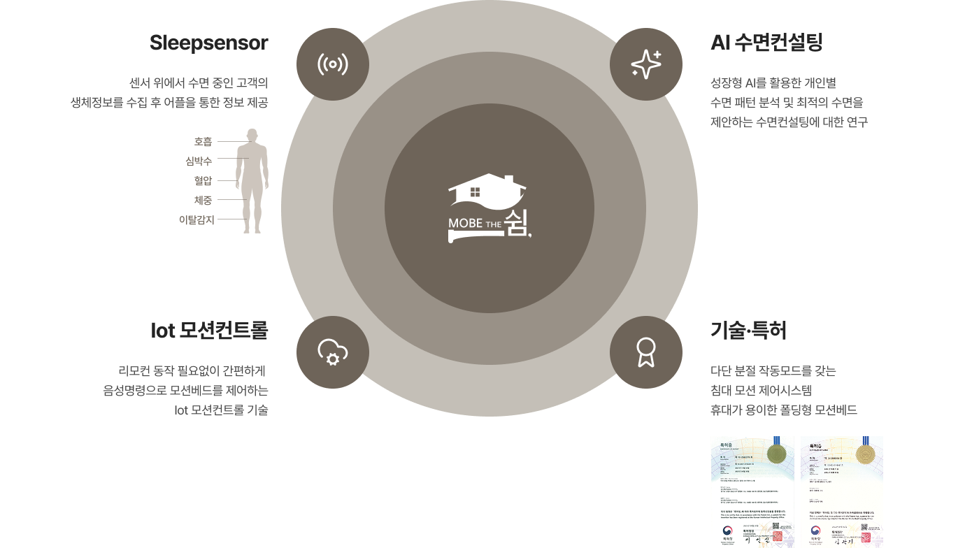 모베더쉼은 의료기기 제조업체로서의 전문성과 모션베드 특허 기술, 그리고 IoT·AI 기반 스마트 제어 기술을 결합해 차별화된 수면 솔루션을 제공합니다. 수면 중 생체 데이터를 정밀하게 분석하고, 사용자 맞춤형 제어와 컨설팅까지 이어지는 통합 기술력으로 ‘움직임을 넘어선 수면 경험’을 구현합니다.